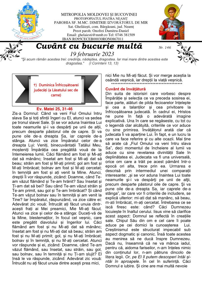 CUVÂNT CU BUCURIE MULTĂ - Parohia ”Sfântul Mare Mucenic Dimitrie Izvorâtorul de Mir” Ghelăiești - 19 februarie 2023