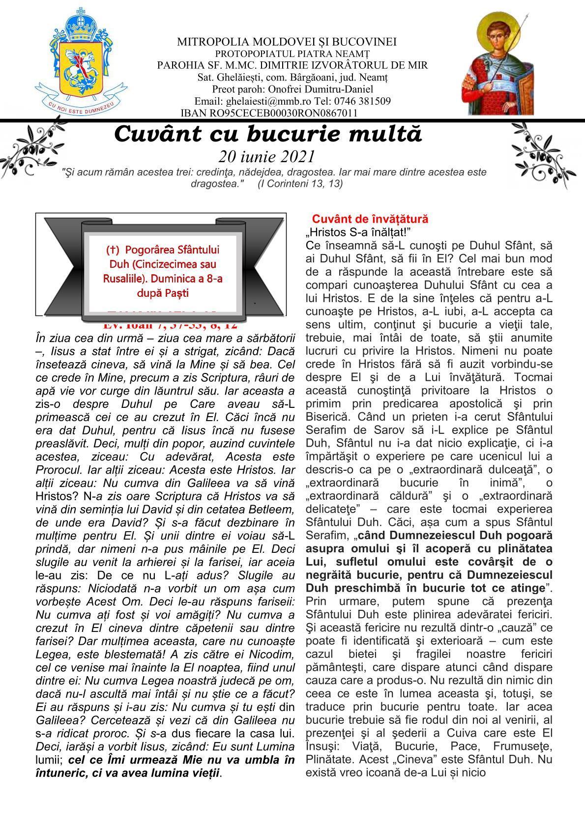 CUVÂNT CU BUCURIE MULTĂ - Parohia ”Sfântul Mare Mucenic Dimitrie Izvorâtorul de Mir” Ghelăiești - 20 iunie 2021