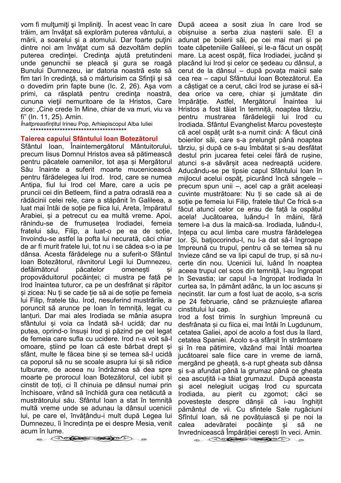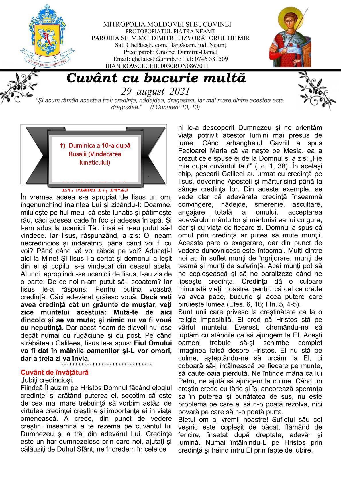 CUVÂNT CU BUCURIE MULTĂ - Parohia ”Sfântul Mare Mucenic Dimitrie Izvorâtorul de Mir” Ghelăiești - 29 august 2021