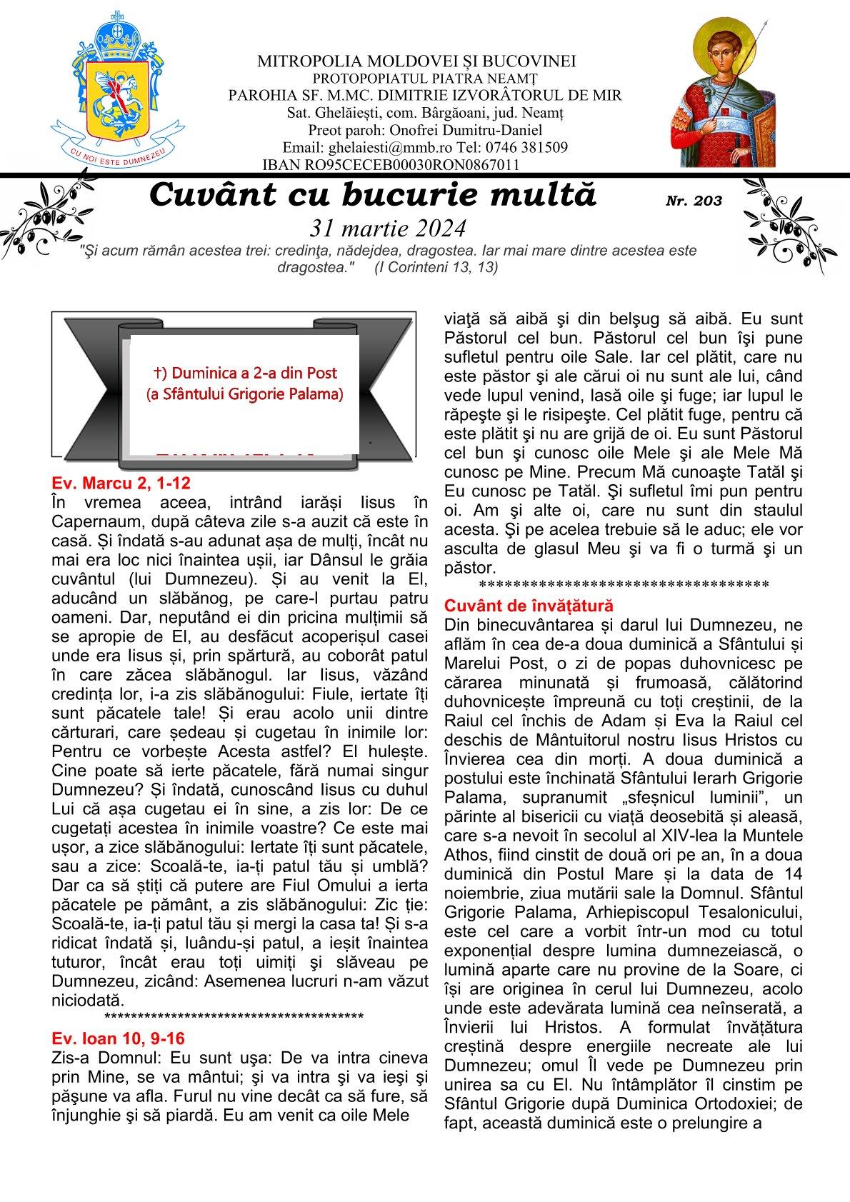 CUVÂNT CU BUCURIE MULTĂ - Parohia ”Sfântul Mare Mucenic Dimitrie Izvorâtorul de Mir” Ghelăiești - 31 martie 2024