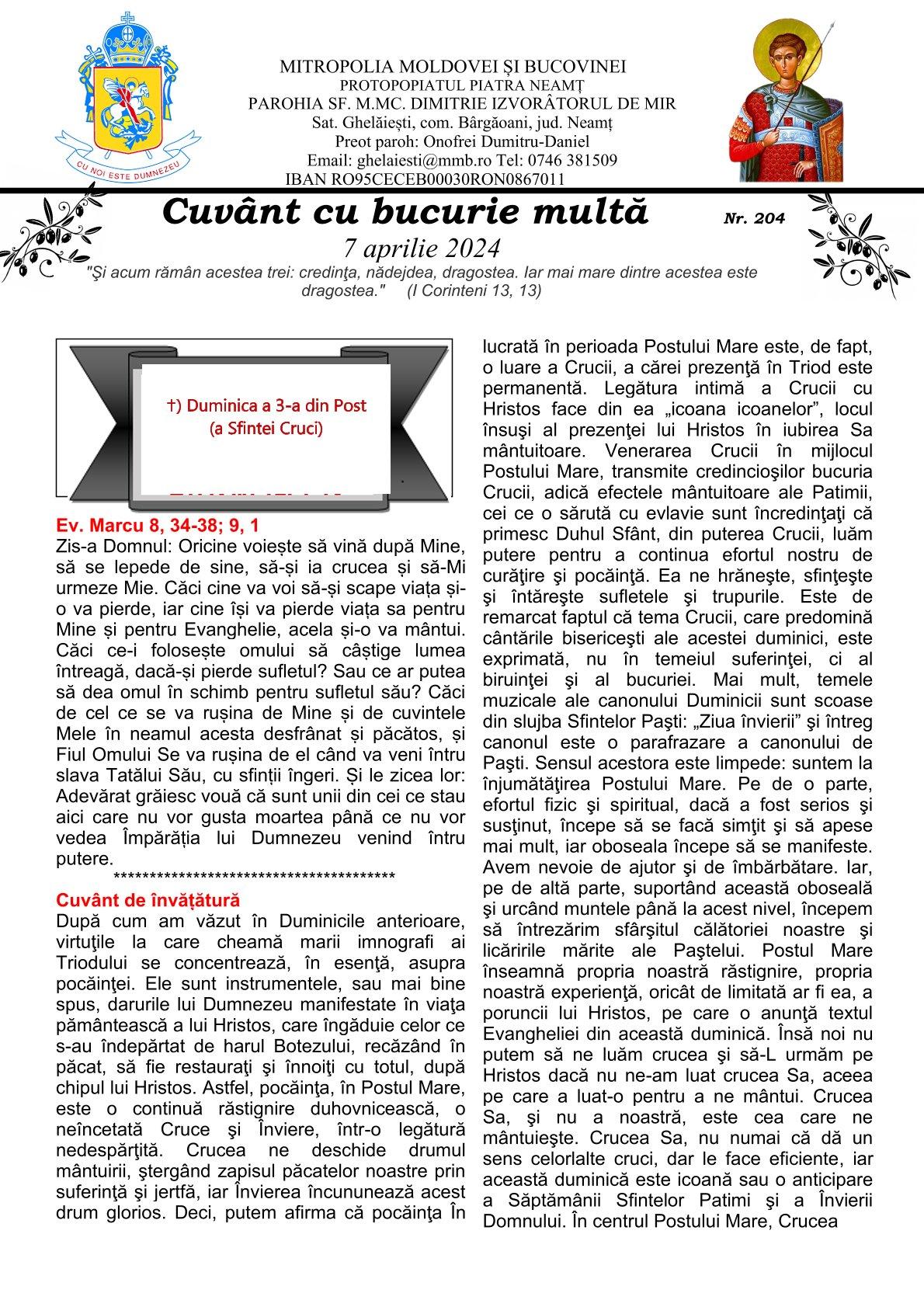 CUVÂNT CU BUCURIE MULTĂ - Parohia ”Sfântul Mare Mucenic Dimitrie Izvorâtorul de Mir” Ghelăiești - 7 aprilie 2024